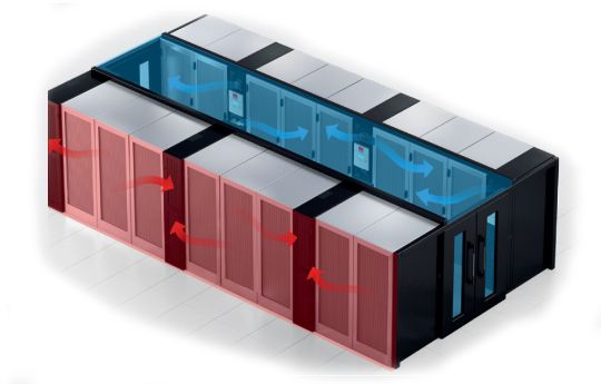 Для изоляции горячего воздуха используются блоки CyberRow с боковой подачей воздуха. Боковой отвод холодного воздуха обеспечивает равномерное распределение по всей длине коридора, в то время как изоляция позволяет эффективно разделять потоки холодного и горячего воздуха. Потоки воздуха полностью защищены от перемешивания, что позволяет повысить эффективность.